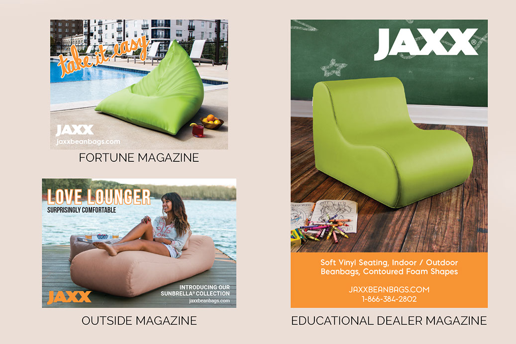 Jaxx designs and manufactures large foam bean bags, modular foam furniture and outdoor seating. Jaxx sells to multiple large scale retailers such as Walmart, Wayfair, Amazon and Overstock. I am challenged to make fun and engaging designs to capture the attention of families world wide, as well as compete with hundreds of other furniture companies for business.